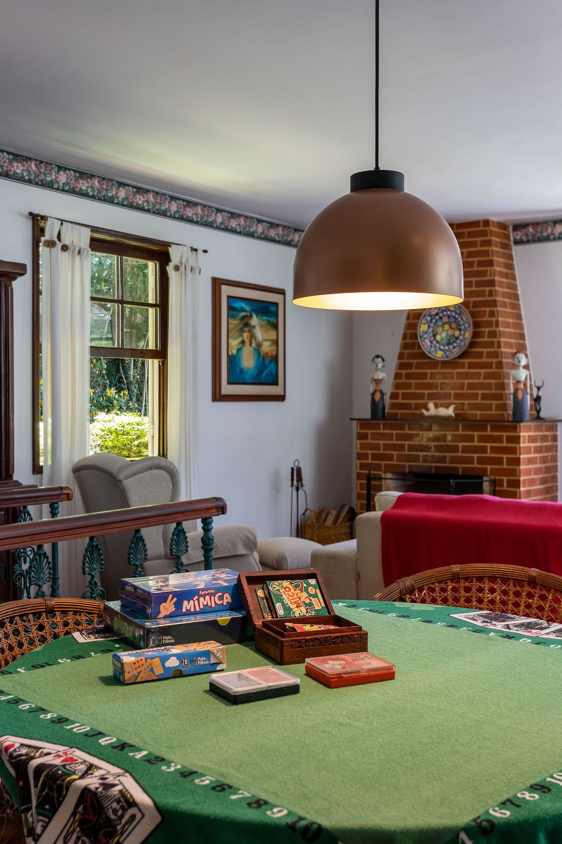 The house features four suites and two additional bedrooms, totaling five and a half bathrooms, ensuring privacy and comfort for everyone. Inside, a living room with three areas, a fireplace, and a game table provides both entertainment and coziness. The modern kitchen and spacious dining room are ideal for family meals or gatherings with friends.