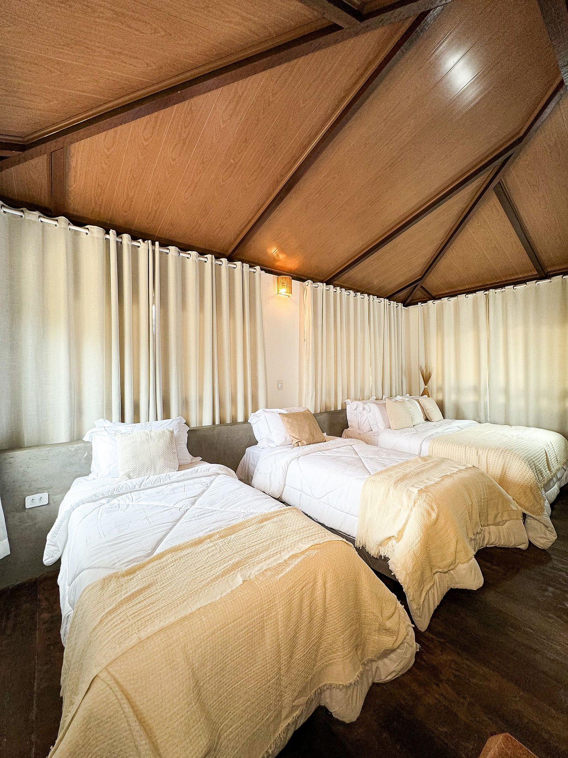 Suite 3 (upper floor): 1 queen bed + 2 single beds, air conditioning, and blackout curtains