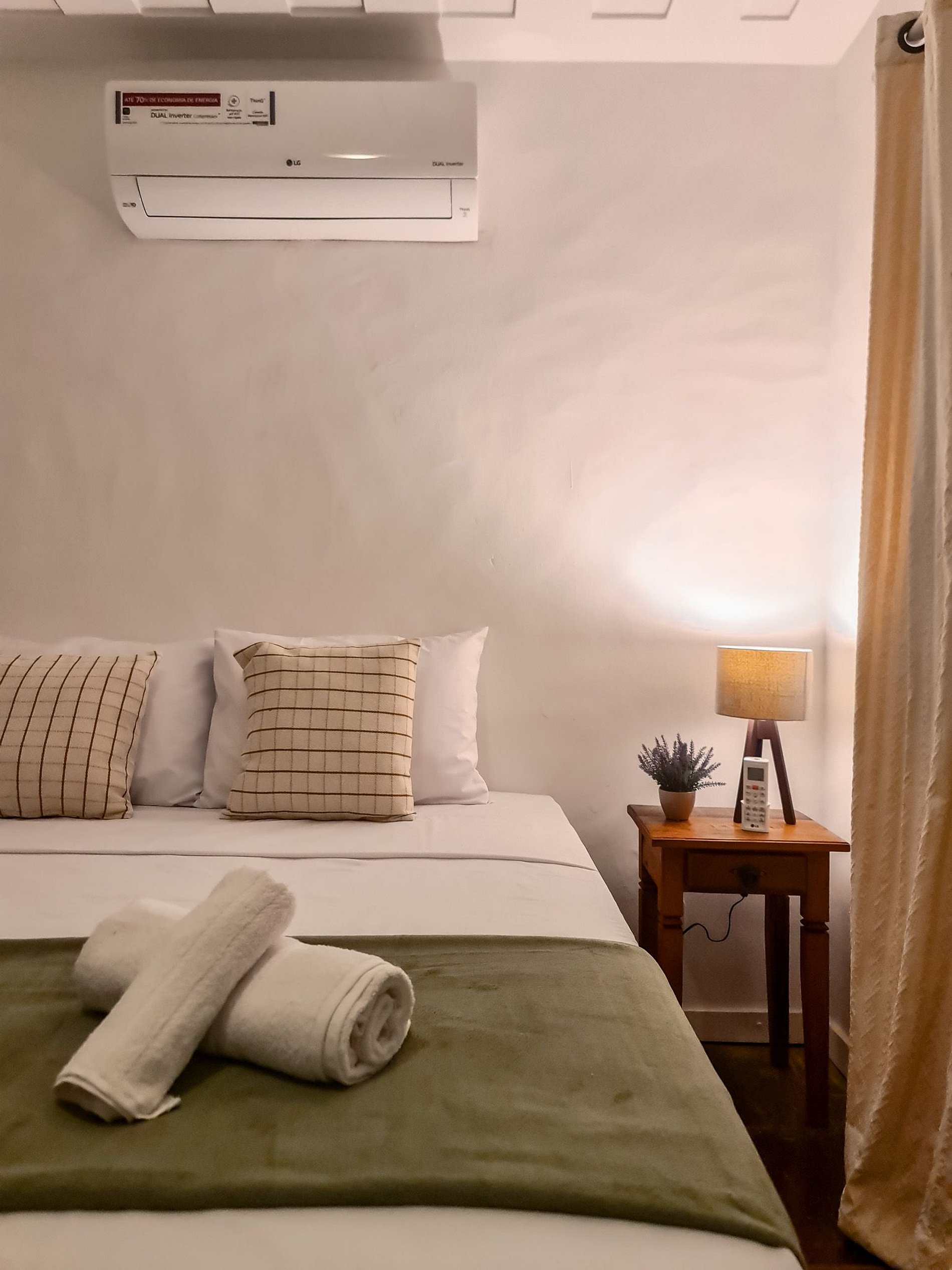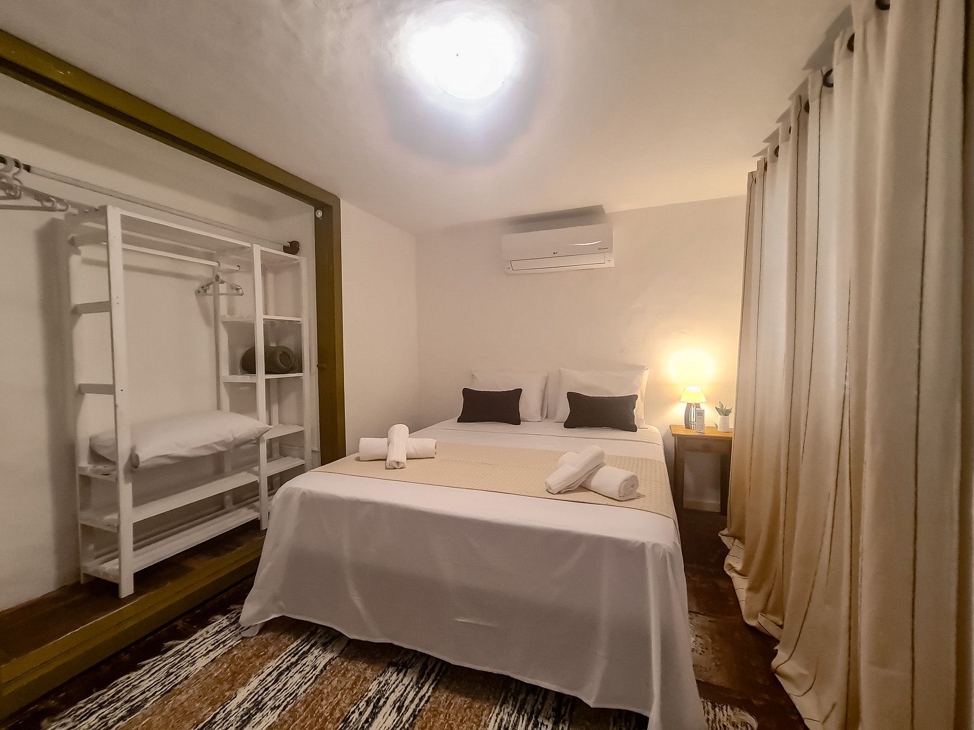 Quarto 3 (Térreo): Decorado com 1 cama queen, este quarto é um refúgio ideal para descanso e privacidade com ar condicionado e black out nas cortinas.
