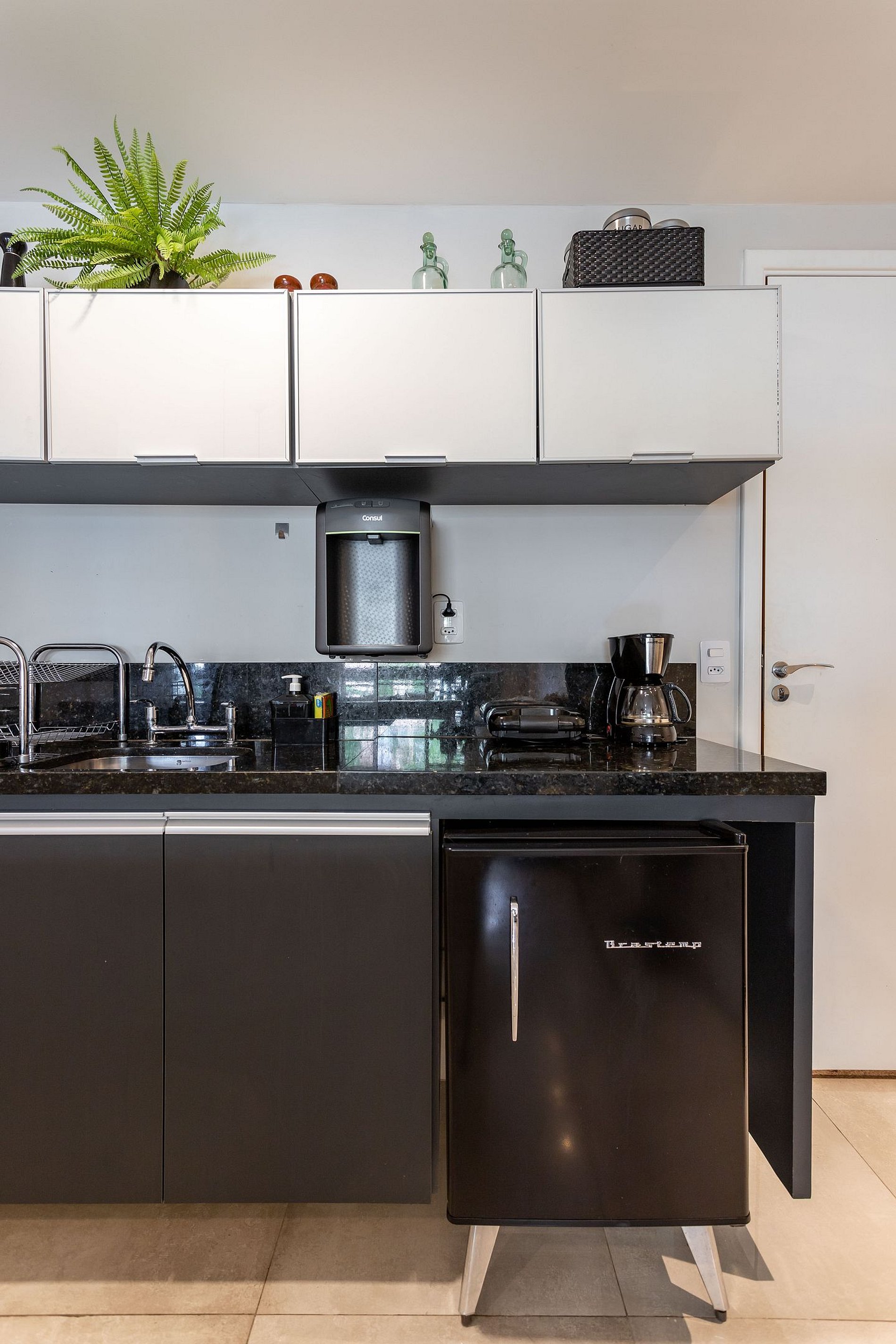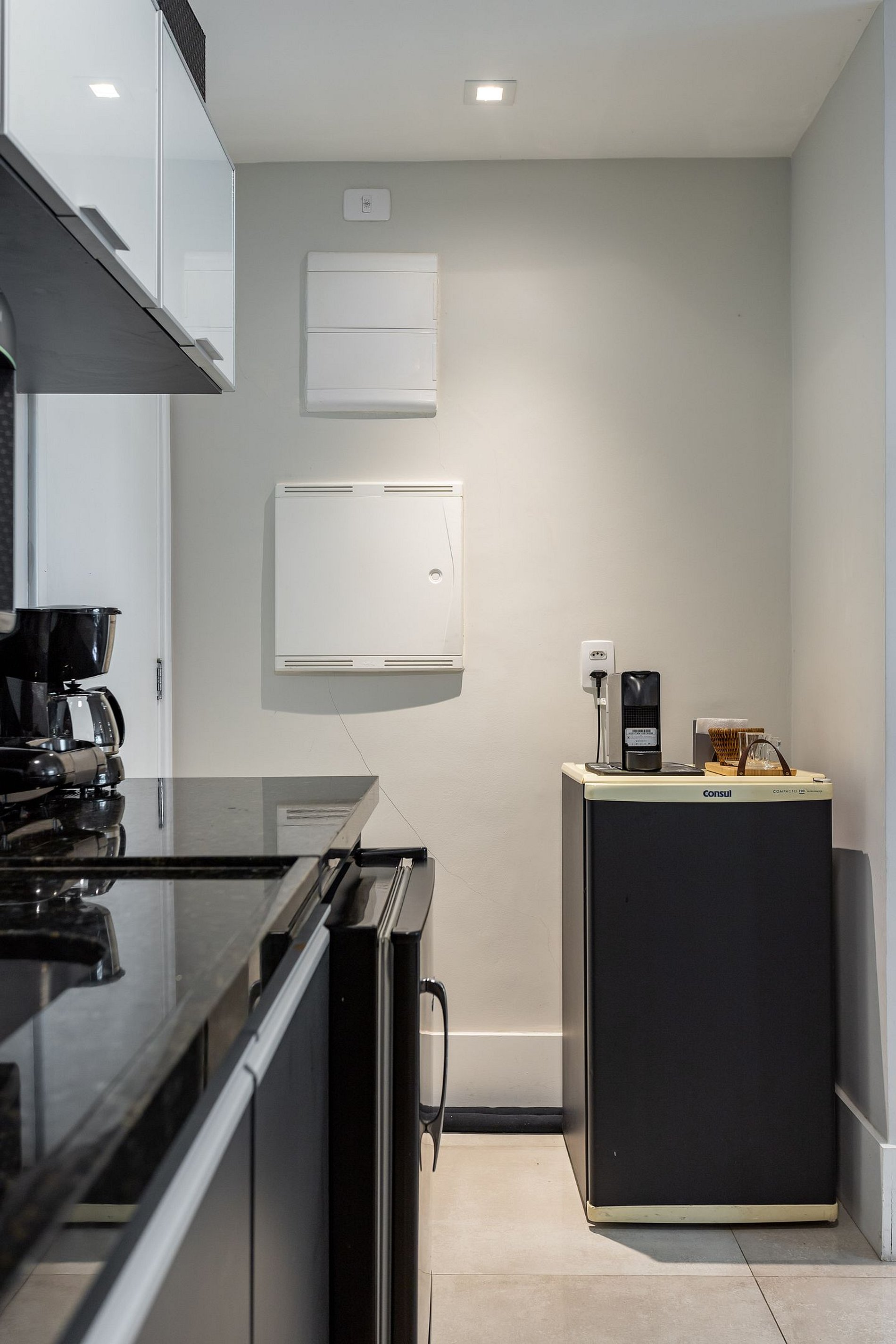 Cozinha equipada com cooktop, geladeira, micro-ondas, cafeteira comum e Nespresso