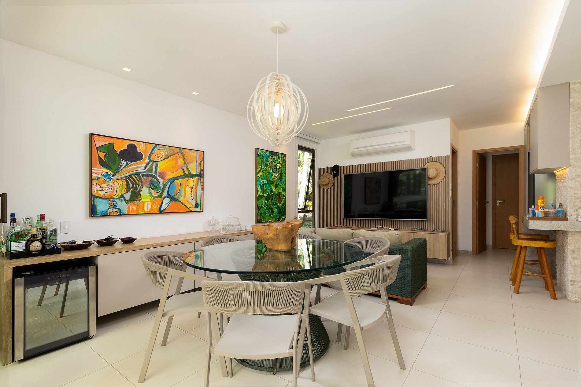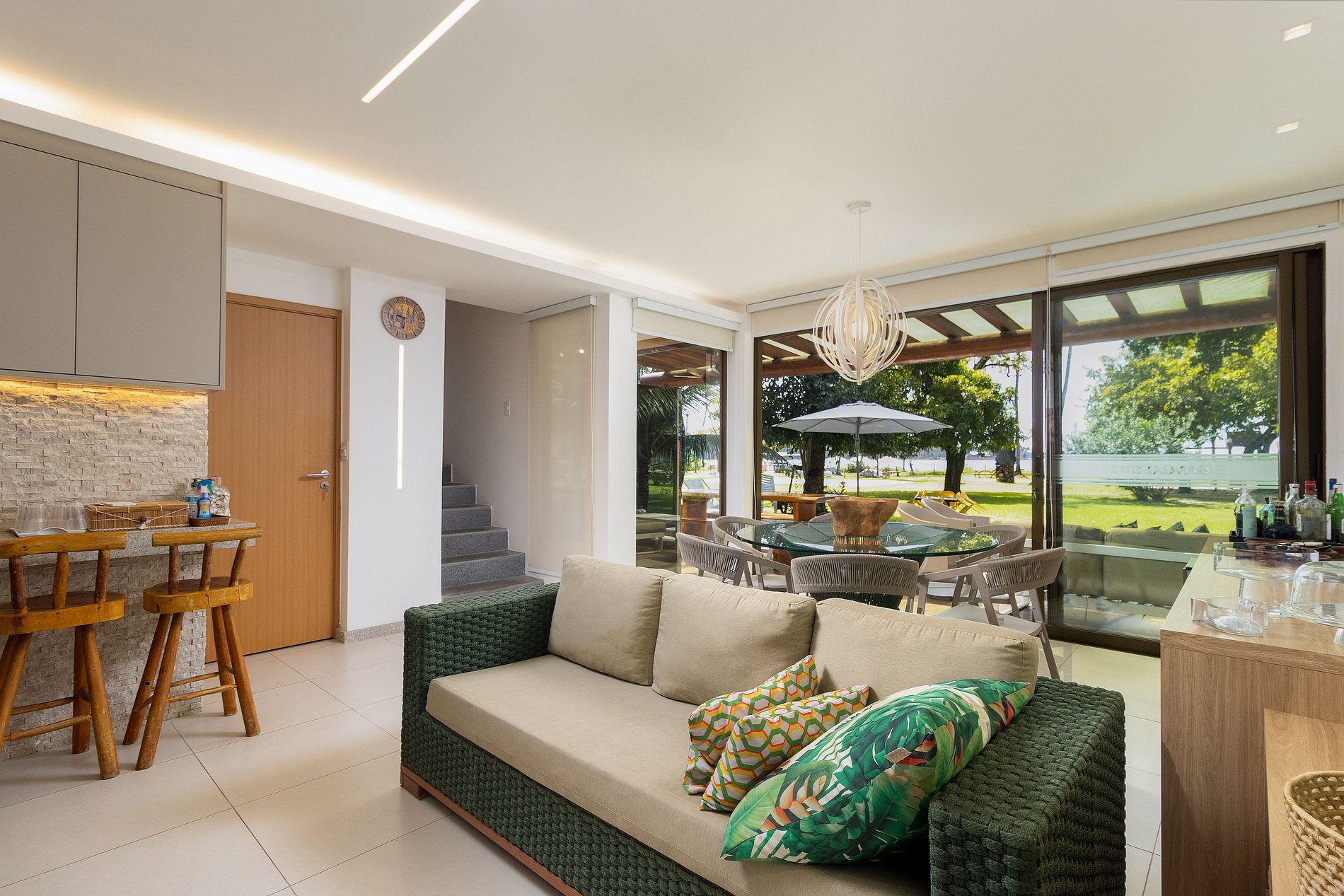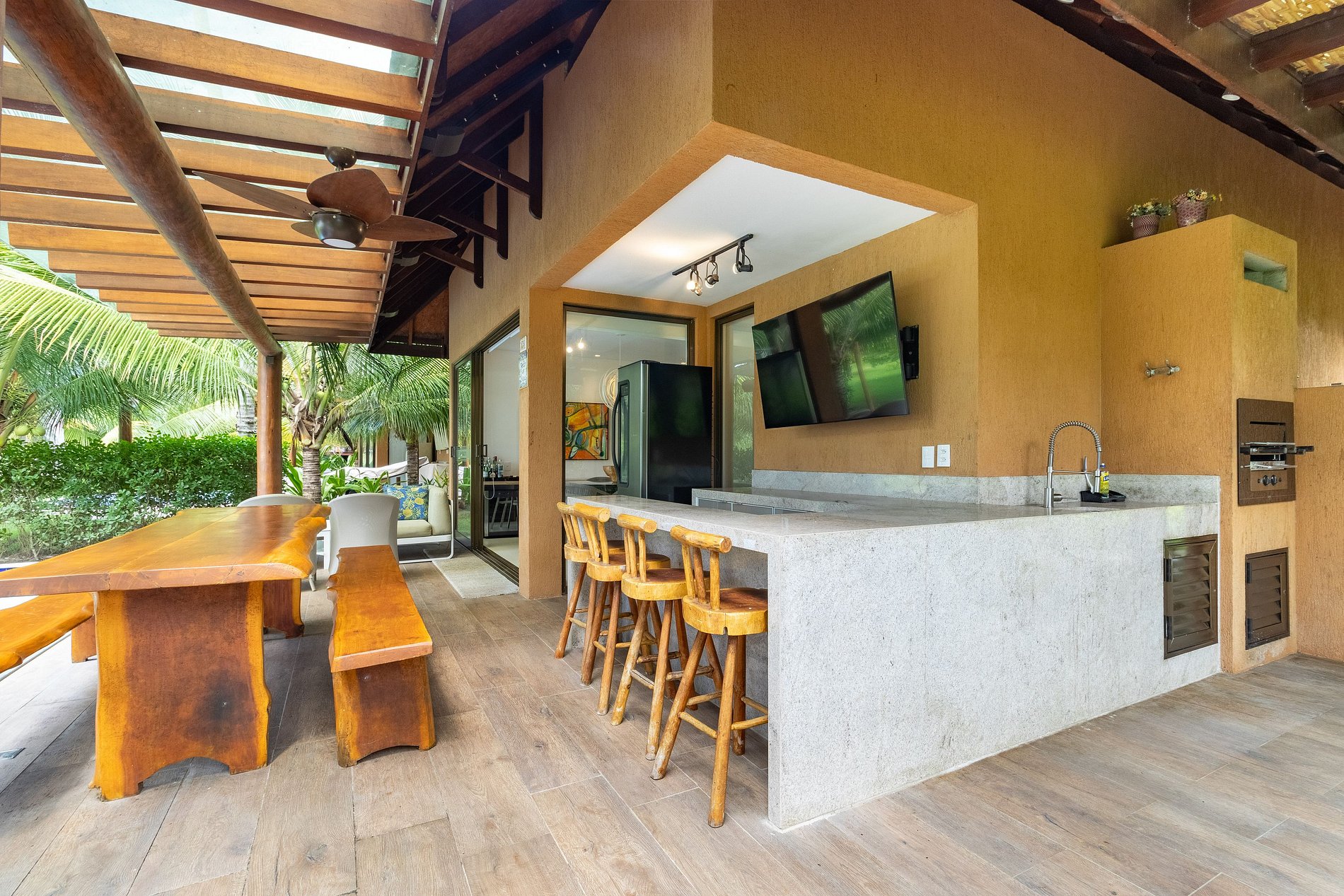 A área gourmet é o destaque, com uma cervejeira, TV e mesa de jantar tanto interna quanto externa, ideal para refeições ao ar livre sob a brisa do mar. Não faltam detalhes para seu conforto, como secador de cabelo e espelho de maquiagem.
