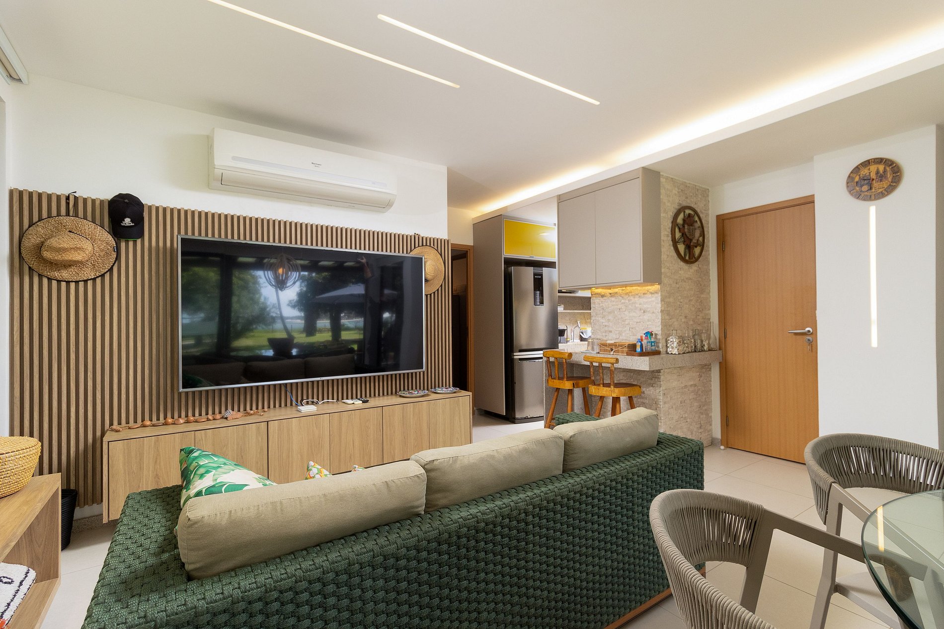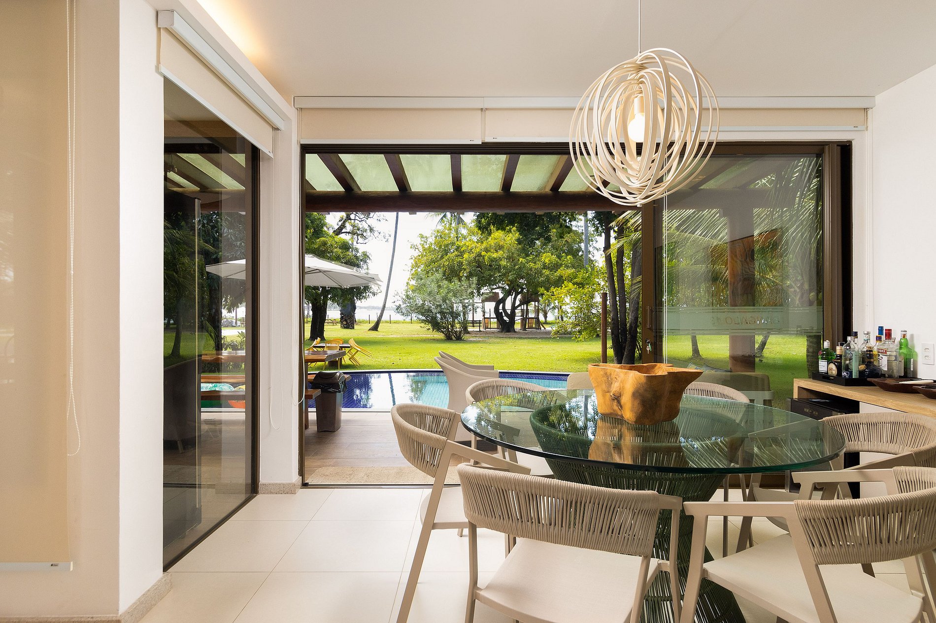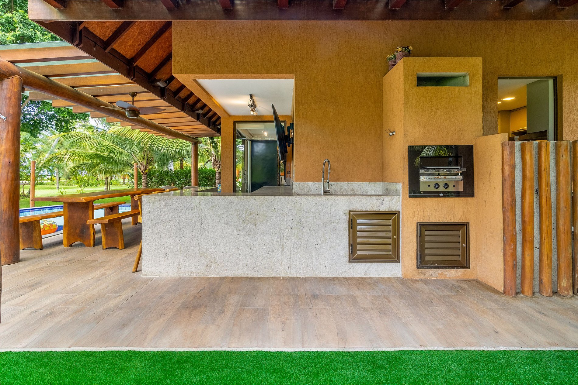A área gourmet é o destaque, com uma cervejeira, TV e mesa de jantar tanto interna quanto externa, ideal para refeições ao ar livre sob a brisa do mar. Não faltam detalhes para seu conforto, como secador de cabelo e espelho de maquiagem.