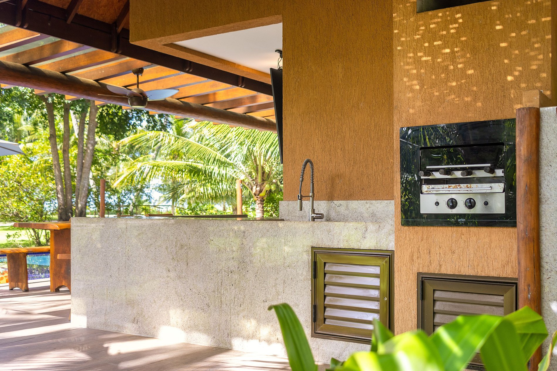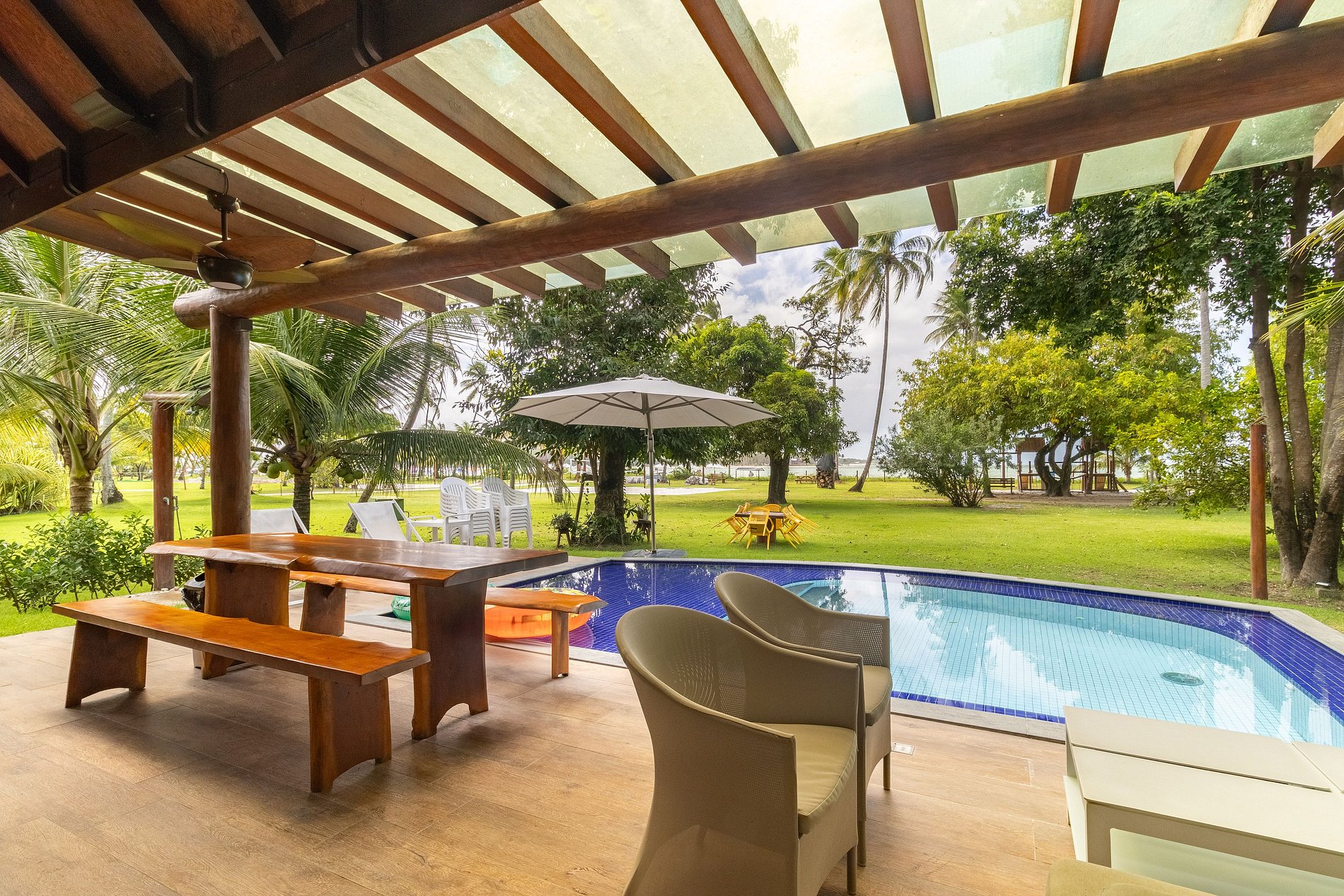 Nosso bangalô, um dos poucos de frente para a praia, oferece 3 suítes com ar-condicionado, com roupas de cama, funcionária incluída que cozinha e arruma, 4 banheiros, piscina privativa, churrasqueira e área gourmet.