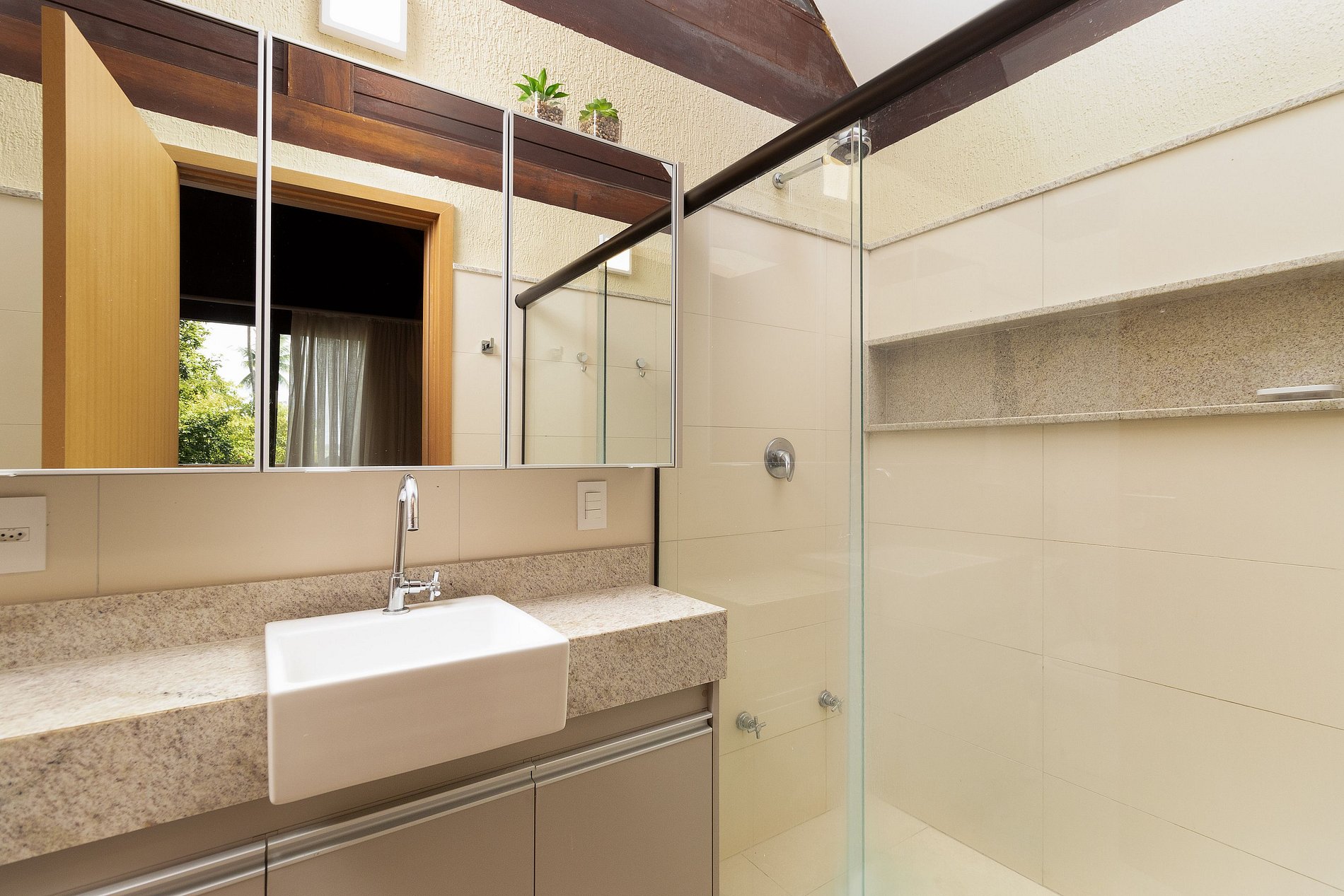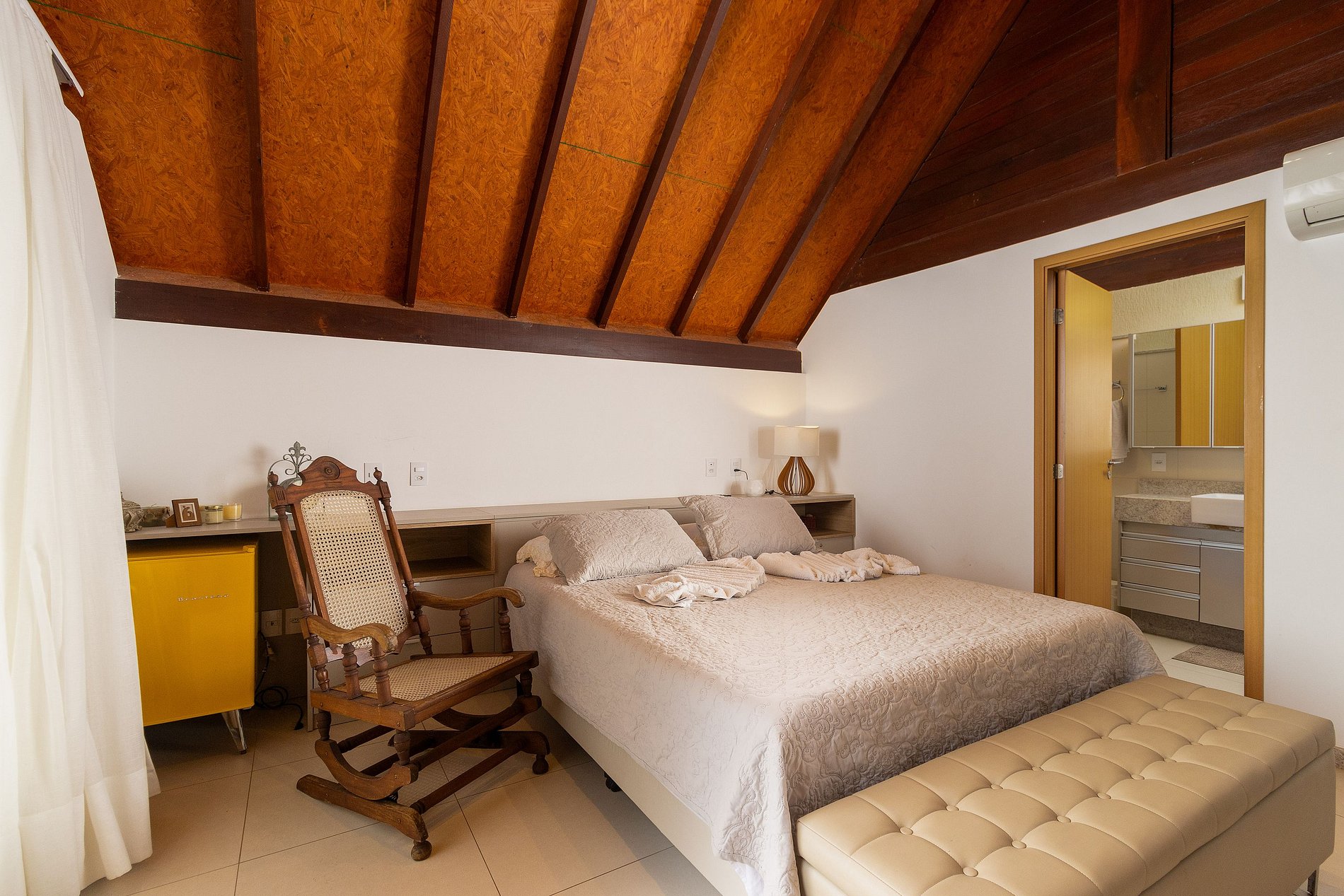 Nosso bangalô possui 3 quartos, todos suítes com ar-condicionado, garantindo conforto absoluto. Com 4 banheiros, você e seus convidados terão toda a privacidade necessária. A área externa é um verdadeiro paraíso, com uma piscina privativa perfeita para um mergulho refrescante e uma churrasqueira para momentos deliciosos de confraternização.