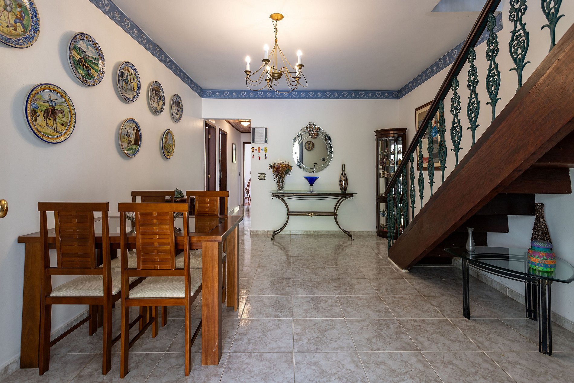 A casa dispõe de quatro suítes e dois quartos adicionais, totalizando cinco banheiros e meio, garantindo privacidade e conforto para todos. No interior, uma sala equipada com mesa de jogos e lareira proporciona diversão e aconchego. A cozinha moderna e uma sala de jantar espaçosa são ideais para refeições em família ou com amigos.