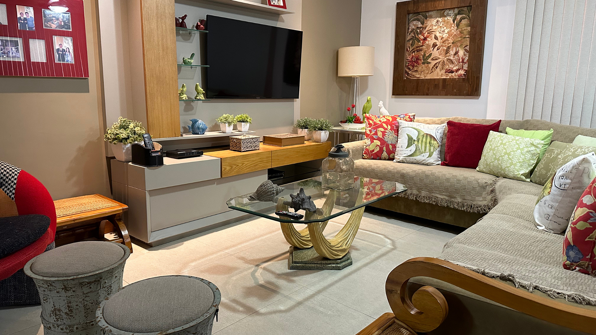 - Sala de Estar: A sala é equipada com sofá, TV e ventilador, criando um espaço agradável para socialização.