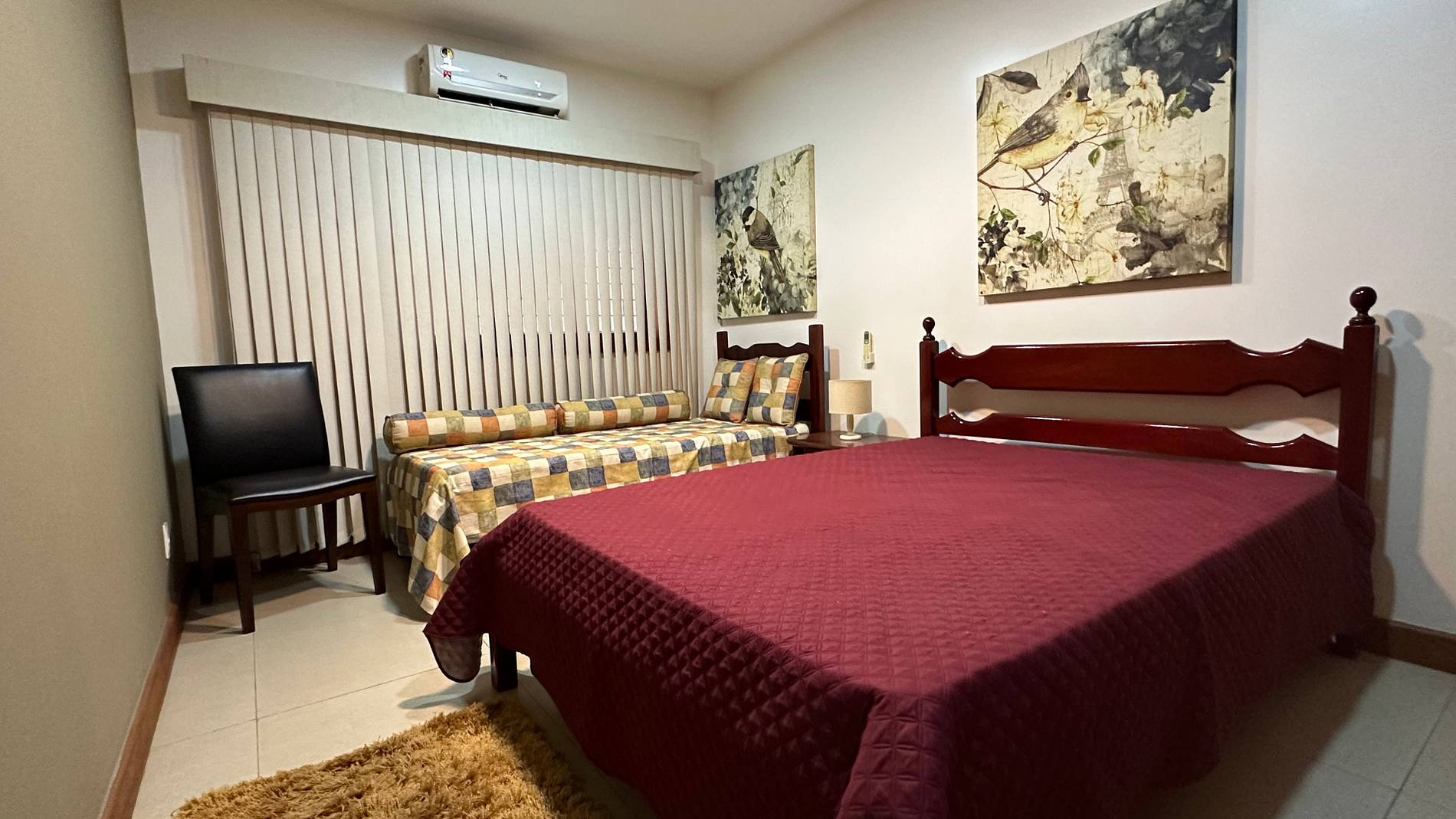 - Suíte Principal: A suíte oferece uma cama queen e uma cama de solteiro, proporcionando conforto e espaço para descanso. Ideal para casais com crianças ou para quem busca privacidade. Tem ar condicionado e TV.