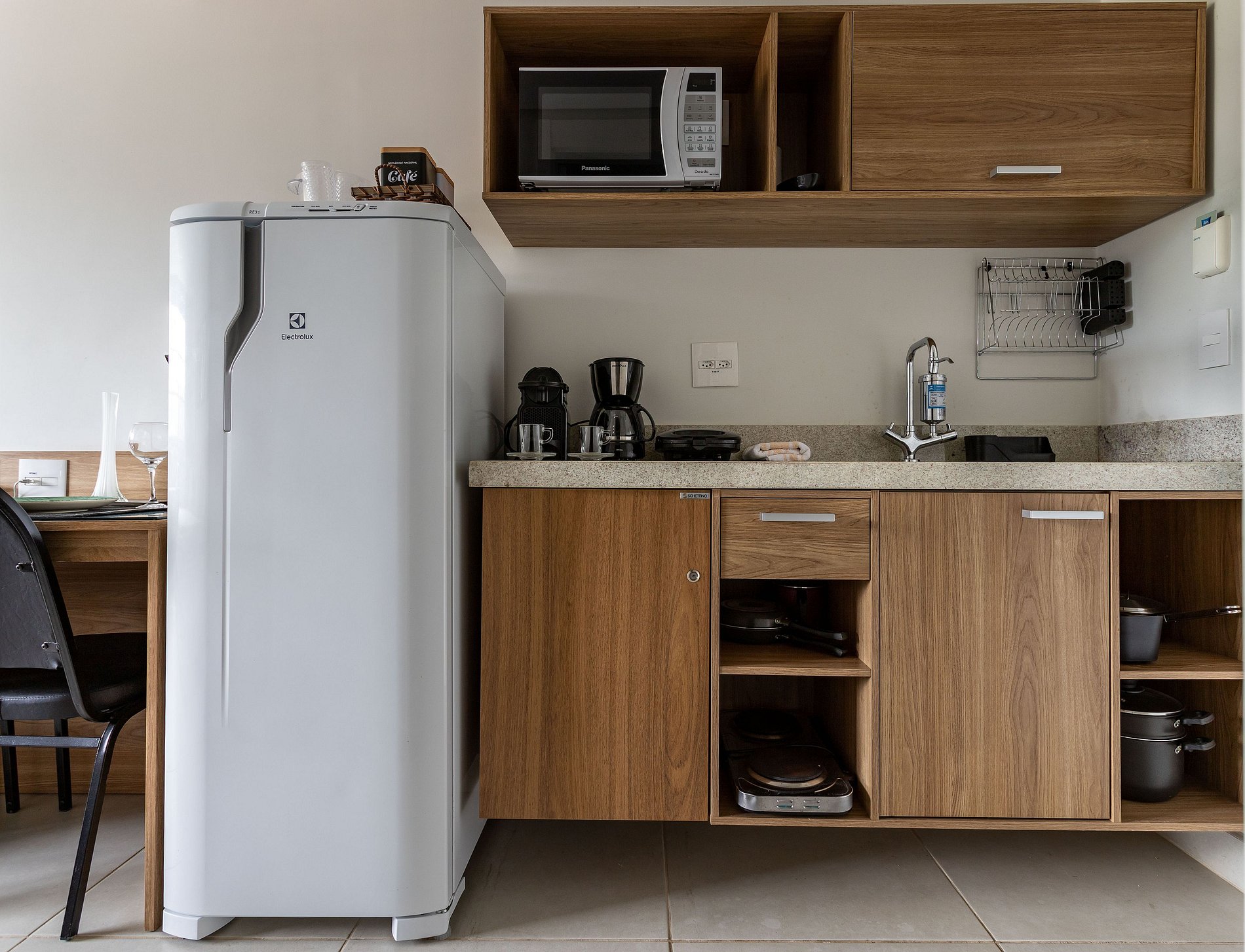 Cozinha compacta equipada com micro-ondas, frigobar, cafeteira Nespresso e comum, utensílios essenciais